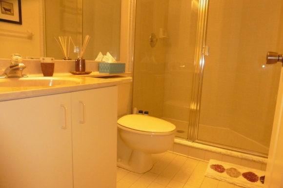 - Guest bathroom directly outside the guest bedroom with a shower/tub combo