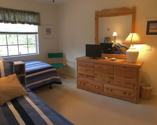 • Upstairs guest bedroom has 2 twin sized beds, flat screen TV and dresser and closet storage space