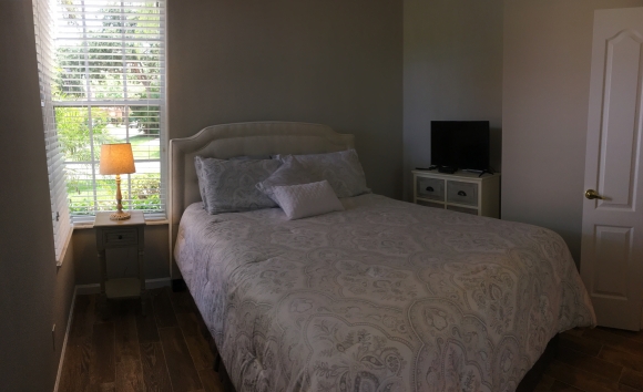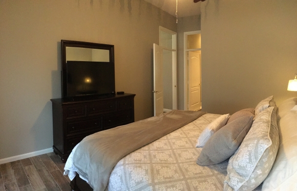 - Master bedroom has a king sized bed, flat screen TV and dresser/closet storage space
