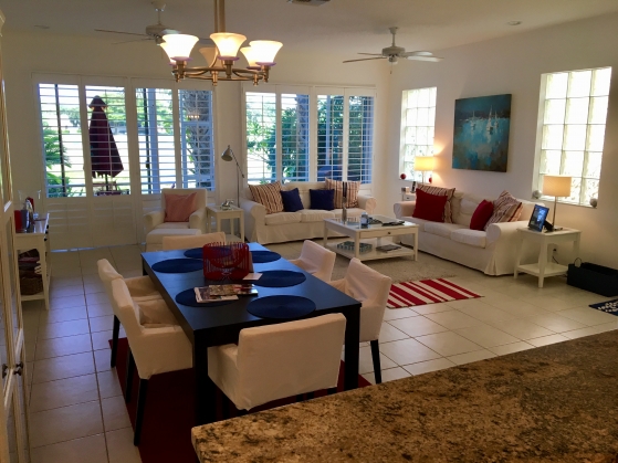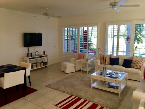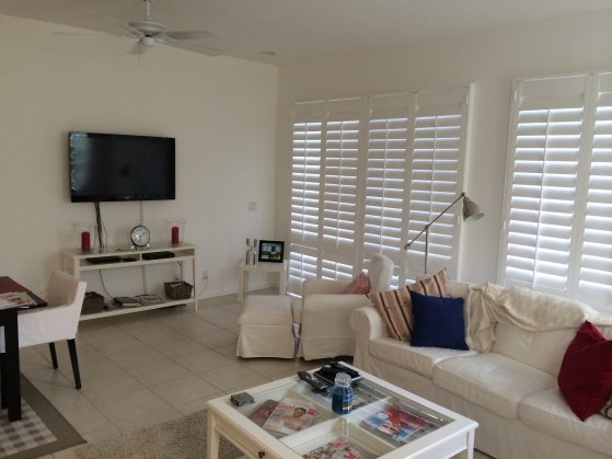 - Open area living room with plantation shutters and modern light deco, flat screen tv and a beautiful view of the Fazio golf course.