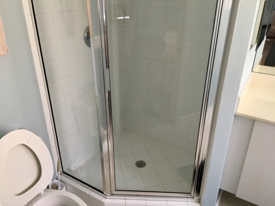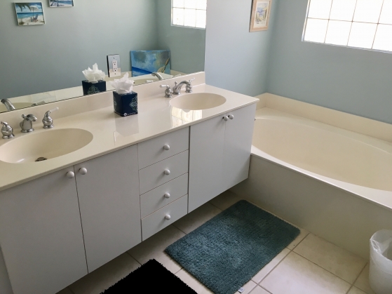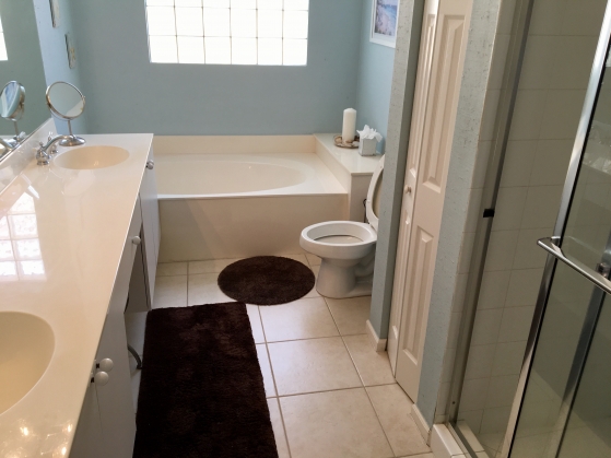 - Guest bathroom has a walk in shower and a tub with dual sinks