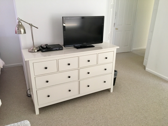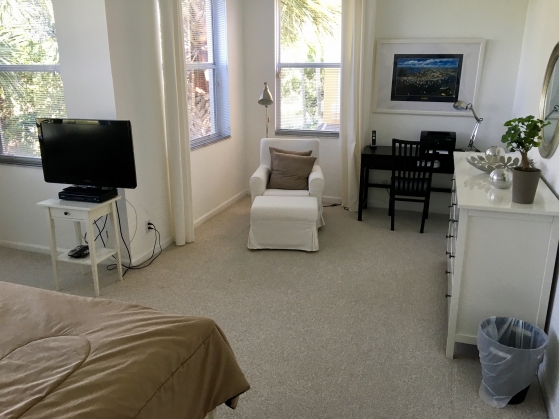 - KIng size bed, flat screen tv, ceiling fan, nice big dresser and a sitting area with a chair and desk.