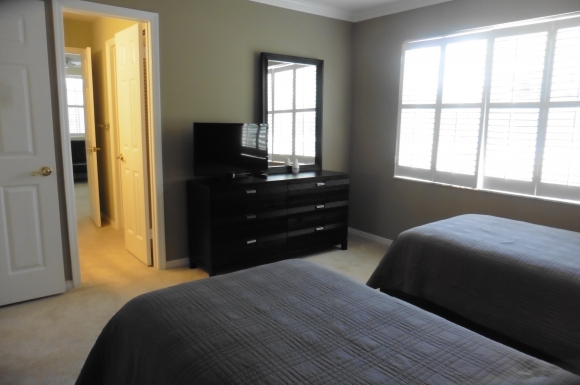 - Upstairs guest bedroom with two twin sized beds, flat screen TV and dresser and closet storage space