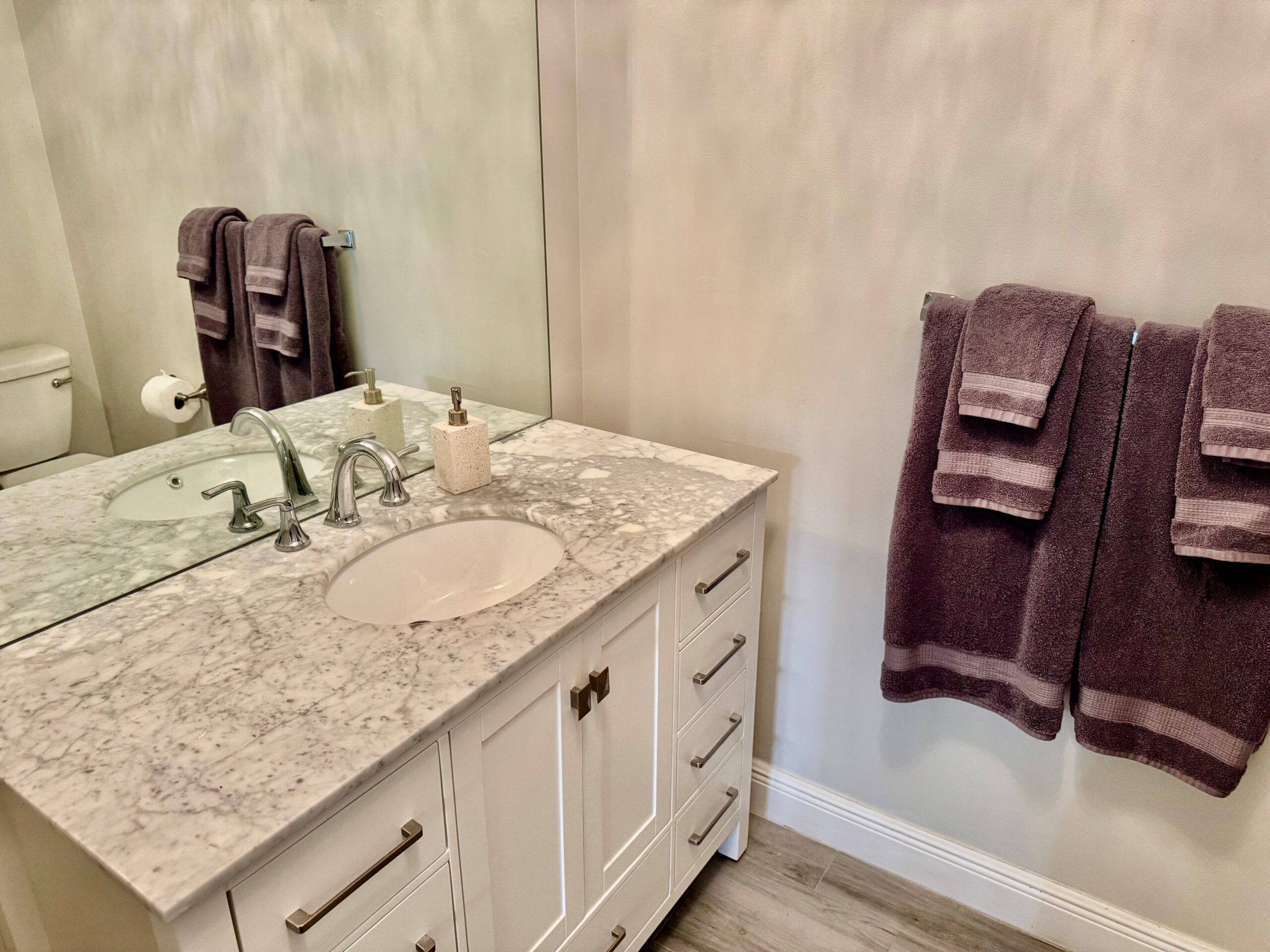 - Queen bed in master bathroom and two full beds in guest bedroom