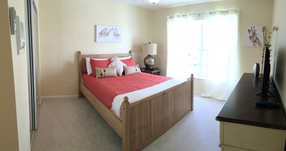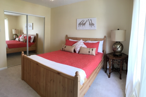 - Guest bedroom has a queen sized bed, flat screen TV, closet and dresser storage space