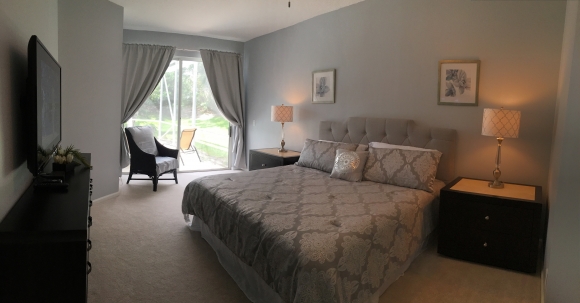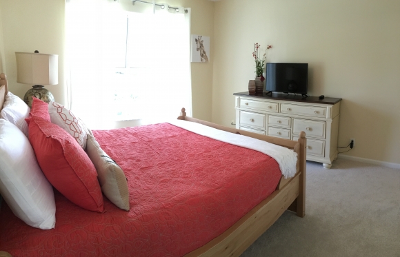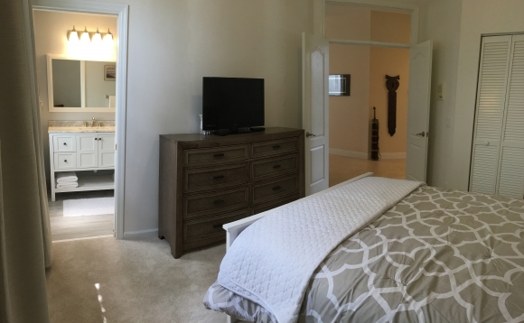 - Master bedroom has a king sized bed, flat screen TV, dresser storage space, large walk in closets