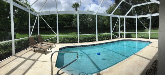 - Screened in patio area with a swimming pool, lounge chairs and a grill.